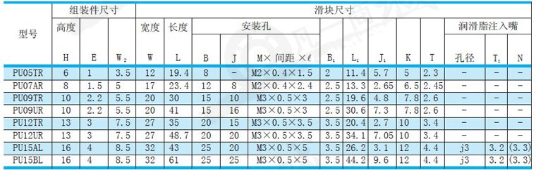NSK直線導軌型號:PU05TR、PU07AR、PU09TR、PU09UR、PU12TR、PU12UR、PU15AL、PU15BL